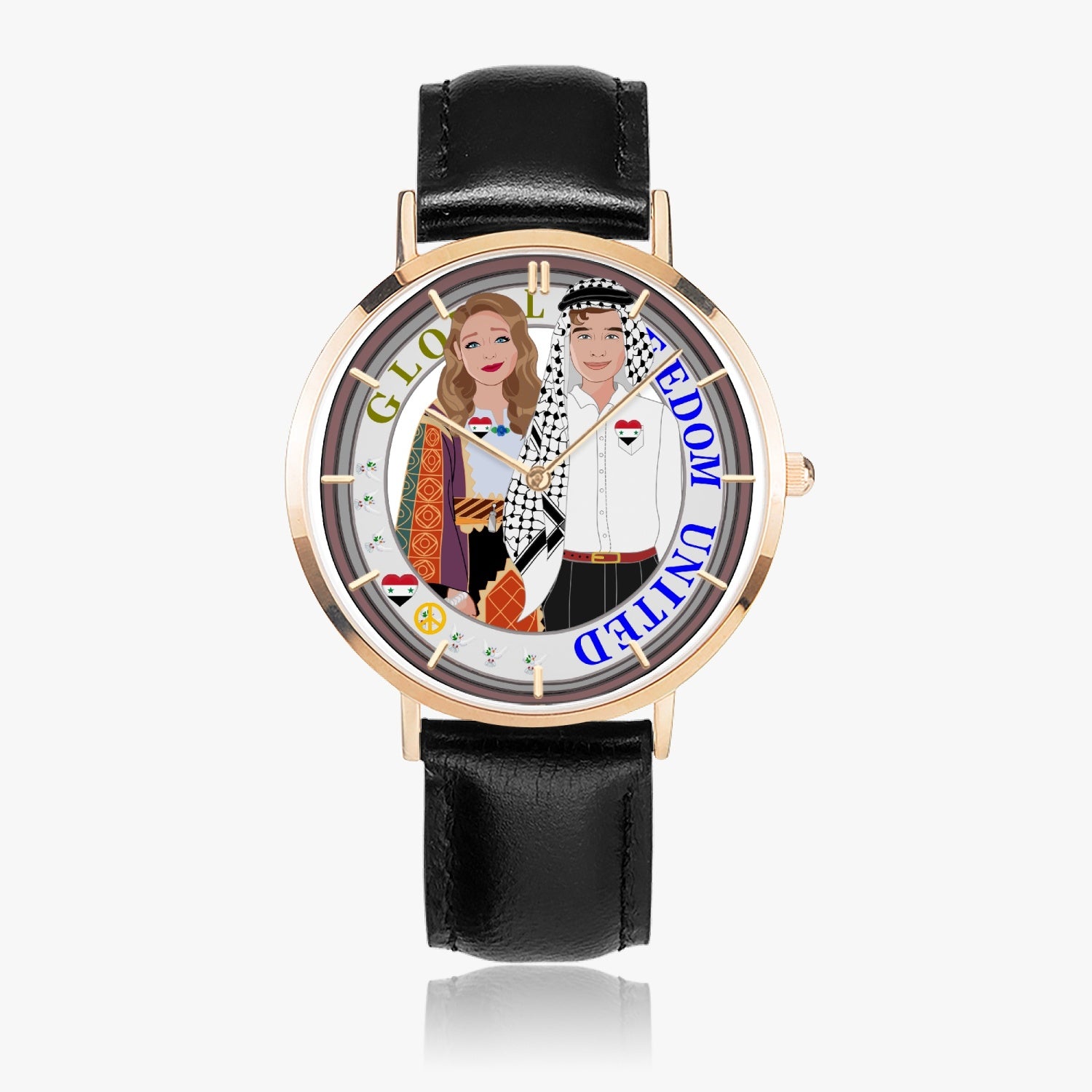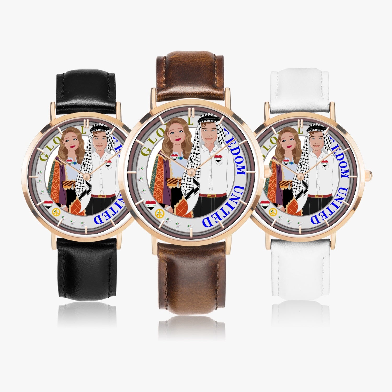 GLOBAL FREEDOM UNITED© Couple Syria Hot Selling Ultra-Thin Leather Strap Quartz Watch (Rose Gold With Indicators)