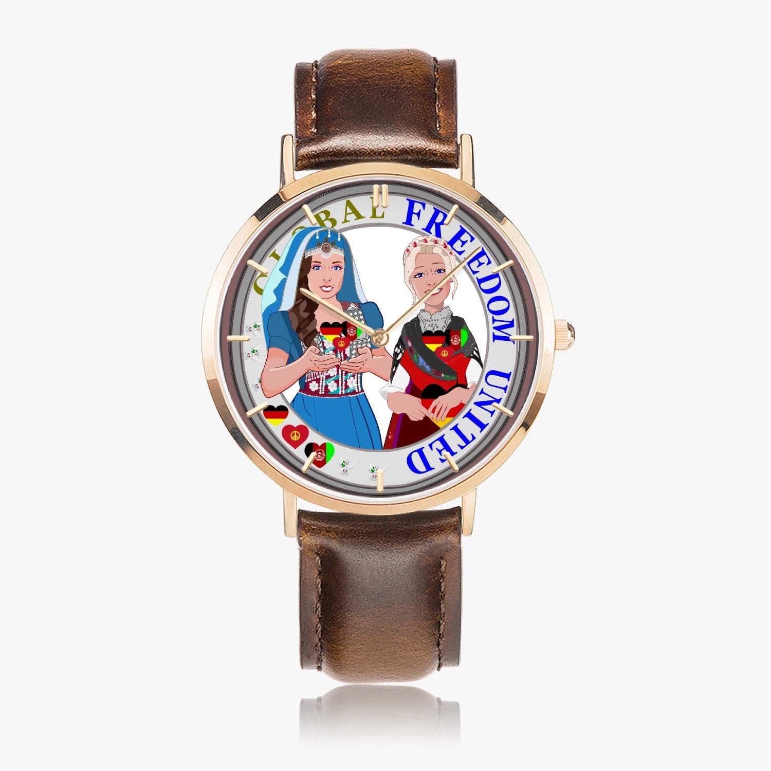 GLOBAL FREEDOM UNITED© Hot Selling Ultra-Thin Leather Strap Quartz Watch (Rose Gold With Indicators) Women Afghanistan & Germany
