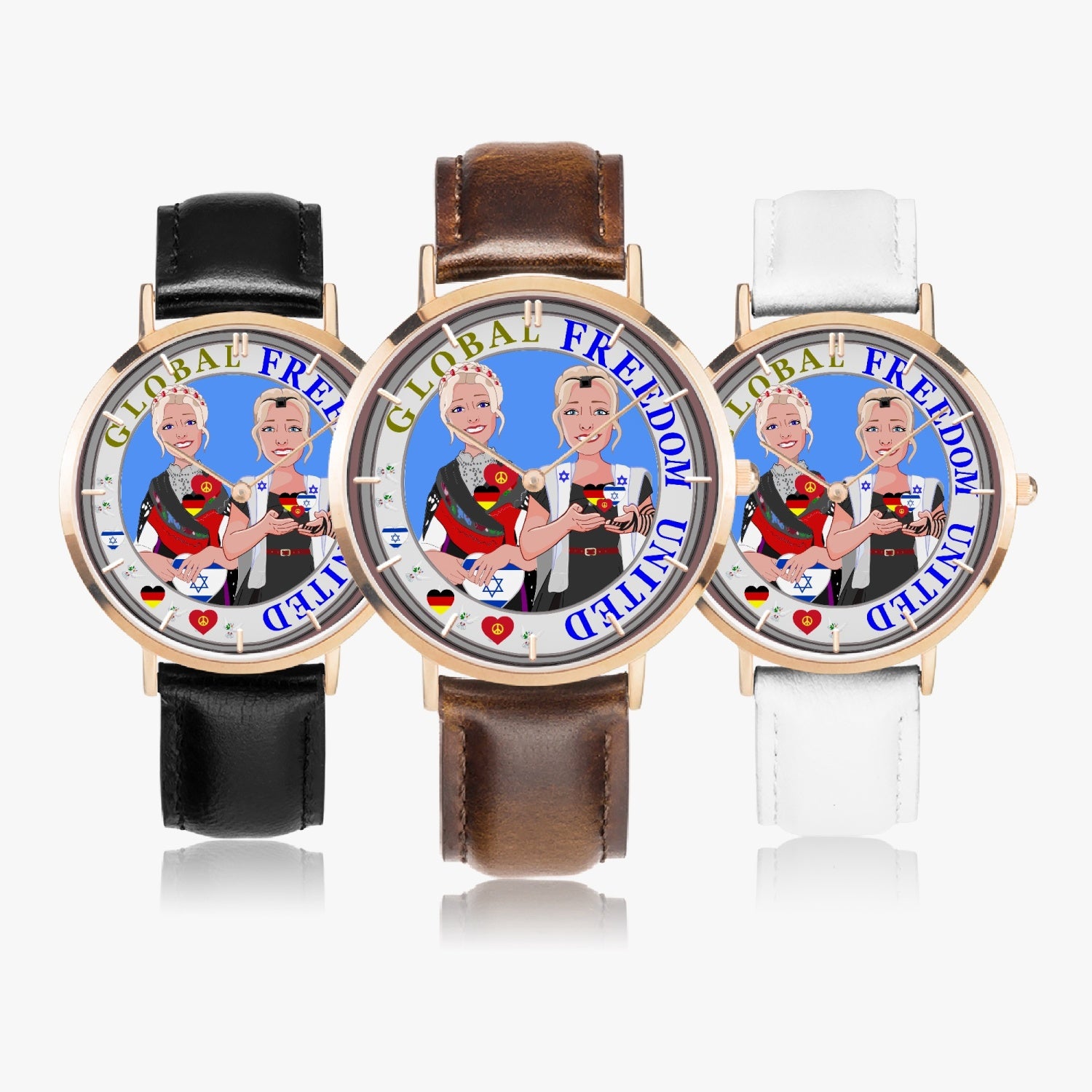 GLOBAL FREEDOM UNITED© Hot Selling Ultra-Thin Leather Strap Quartz Watch (Rose Gold With Indicators) Women Germany & Israel