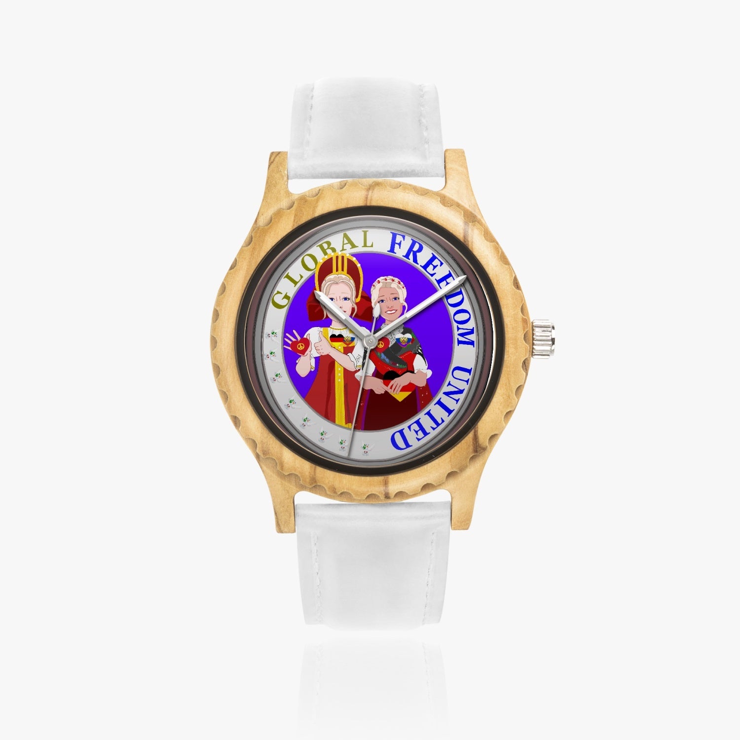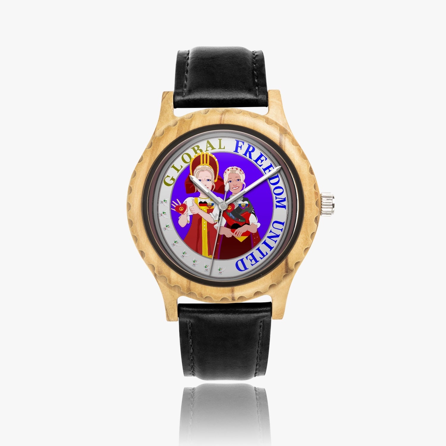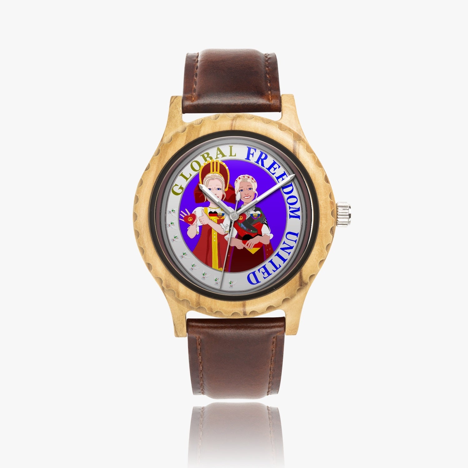 GLOBAL FREEDOM UNITED RUSSIA & GERMANY OLD PEACE Italian Olive Lumber Wooden Watch - Leather Strap