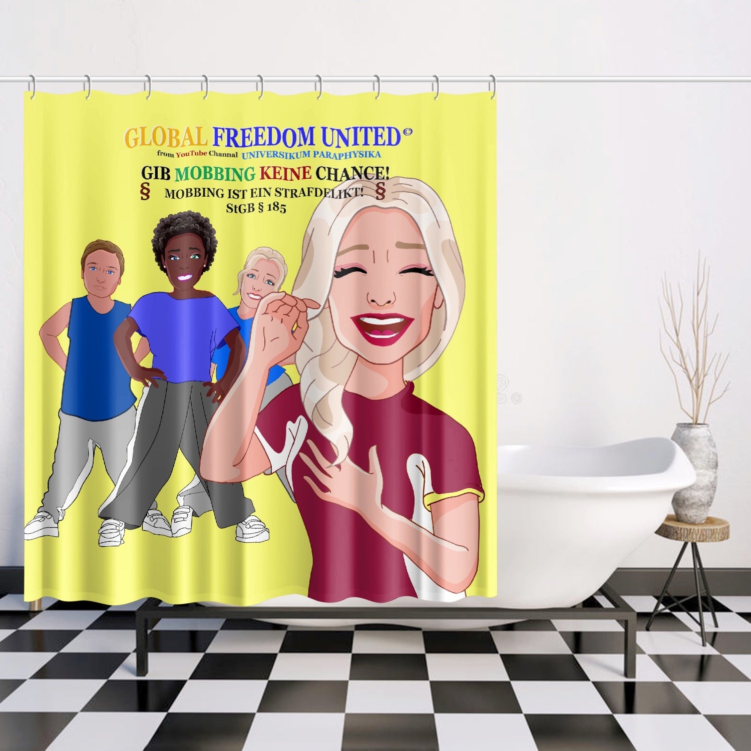 Quick-drying Shower Curtain GLOBAL FREEDOM UNITED GIB MOBBING KEINE CHANCE GERMAN YELLOW