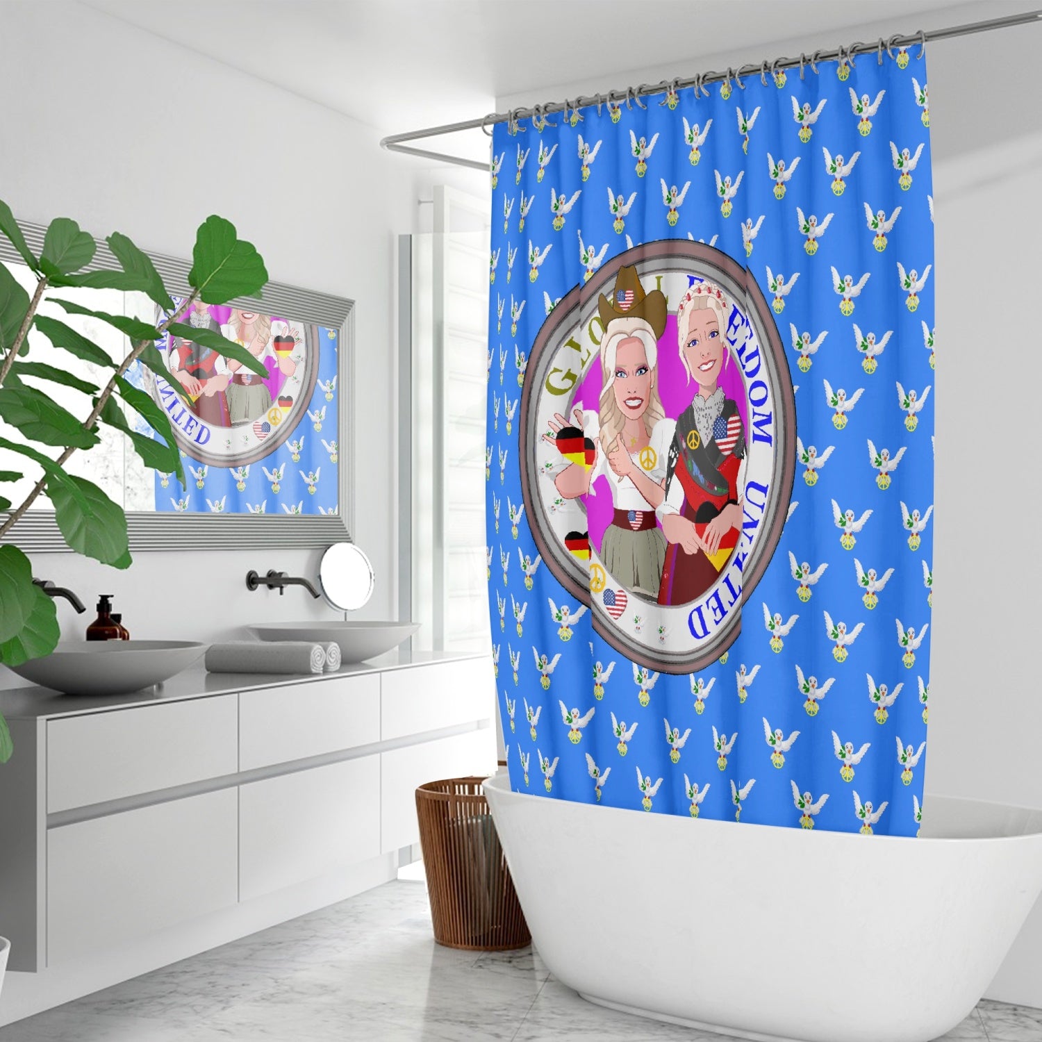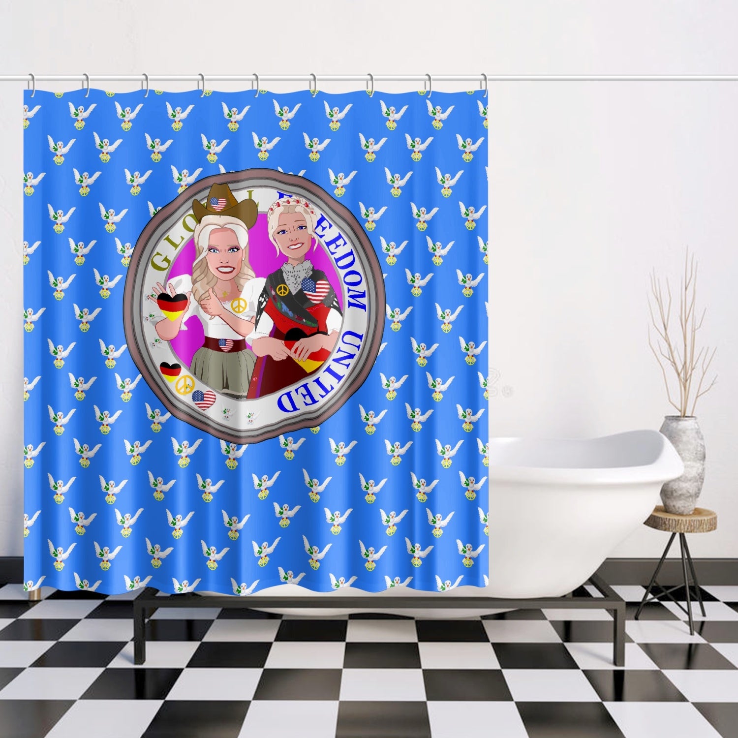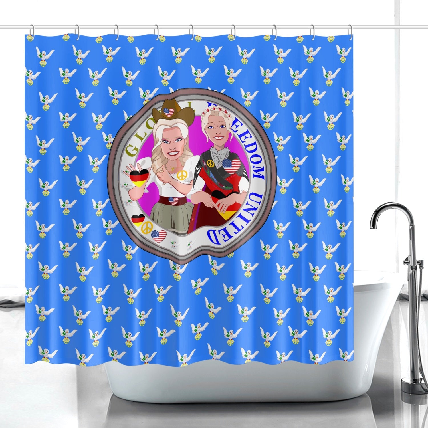 SHOWER CURTAIN GLOBAL FREEDOM UNITED WOMEN GERMANY & USA OLD PEACE BLUE